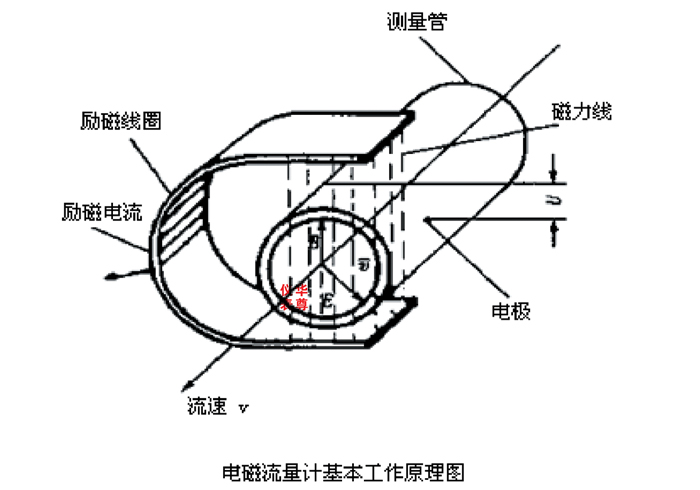 E=KBdv,式中:E-電極間的信號電壓(v);B-磁通密度(T);d-測量管內徑(m);V-平均流速(m/s)。K,d為常數,由于勵磁電流是保持恒流的,故B也是常數,則由E=KBdv可知,體積流量Q與信號電壓E成正比,即流速感應的信號電壓E與體積Q成線性關系。因此只要測量出E就可以確定流量Q,這就是電磁流量計的基本工作原理。