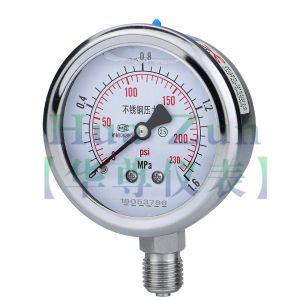 4、應根據鍋爐工作壓力來選擇,量程刻度的極限值應為工作壓力的1.5~3.0倍,zui好是2倍。在工業鍋爐中,實際情況是鍋爐實際運行時的工作壓力總是比銘牌上的額定壓力要低,工業蒸汽鍋爐和熱水采暖鍋爐均是如此。例如4t/h的蒸汽鍋爐,額定壓力為1MPa,制造廠如按1.5倍來配備壓力表,應配備1.6MPa量程壓力表。若用戶由于生產工藝需要,實際運行在0.5MPa壓力下即能滿足工藝要求,這時運行量程,壓力表的指針就指在量程的三分之一不到的位置,指針轉過角度很小.即選用的壓力表量程太大。 熱水鍋爐也是如此,例如采暖鍋爐額定壓力為0.7MPa,配備壓力表應為1MPa或1.6MPa,如配備1MPa的壓力表,怕在水壓試驗時使壓力表過載,于是便配備量程為1.6MPa的壓力表。實際運行時,只要0.2MPa就能滿足采暖要求,壓力表的指針指在量程八分之一的位置,很難使人相信壓力表的準確性和靈敏性。
