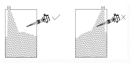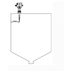 垂直安裝時,為了避免圓柱容器中介質(zhì)堆角和容器壁自身電抗造成的測量誤差,建議安裝在距離容器壁大于500mm處(見圖)。