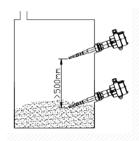 當(dāng)由于測量需要,料倉內(nèi)要求安裝多臺儀表時,應(yīng)保證儀表之間的安裝間距大于500mm,防止儀表之間的探頭相互干擾,導(dǎo)致測量不可靠(見圖)。