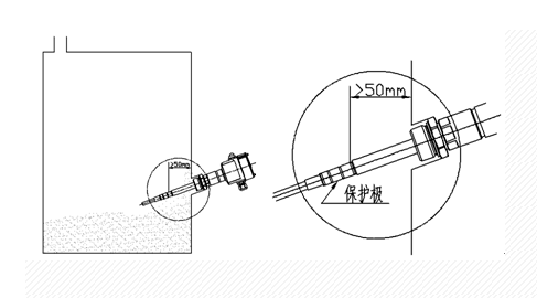 為保證儀表抗粘附的功能,儀表安裝時應(yīng)保證探頭保護(hù)極插入料倉內(nèi)的尺寸大于50mm(見圖)